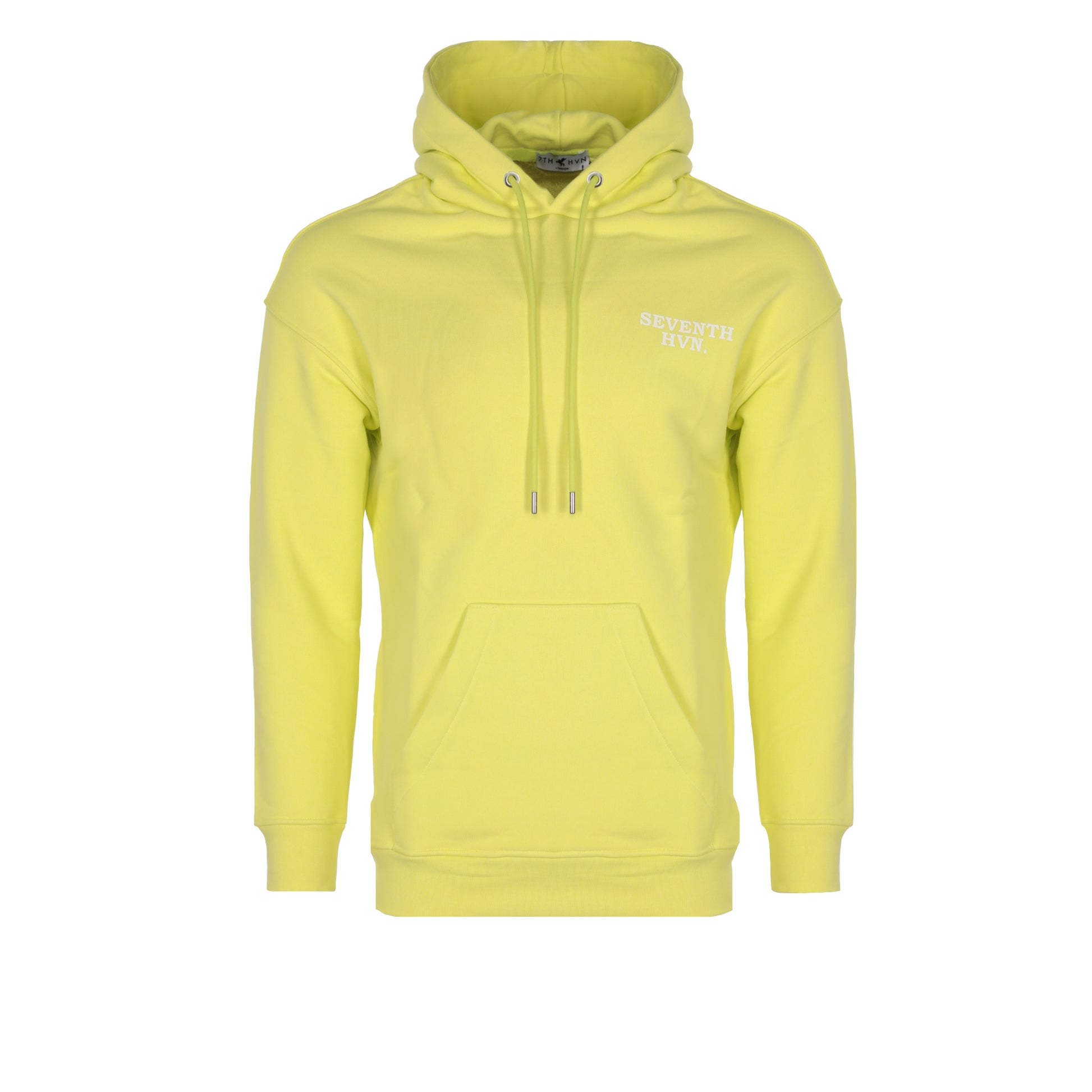 LONG SLEEVE HOODIE IN NEON YELLOW WITH THE ''SEVENTH HVN''LOGO PRINTED IN WHITE ON FRONT AND WORLWIDE AT BACK. DROP SHOULDERS.